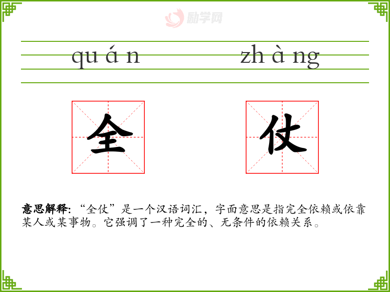 “全仗”是一个汉语词汇,字面意思是指完全依赖或依靠某人或某事物。它强调了一种完全的、无条件的依赖关系。