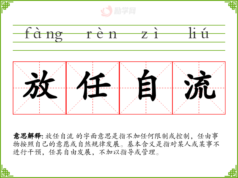 放任自流 的字面意思是指不加任何限制或控制,任由事物按照自己的意愿或自然规律发展。基本含义是指对某人或某事不进行干预,任其自由发展,不加以指导或管理。