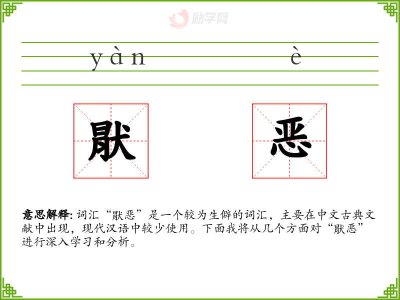 词汇“猒恶”是一个较为生僻的词汇,主要在中文古典文献中出现,现代汉语中较少使用。下面我将从几个方面对“猒恶”进行深入学习和分析。