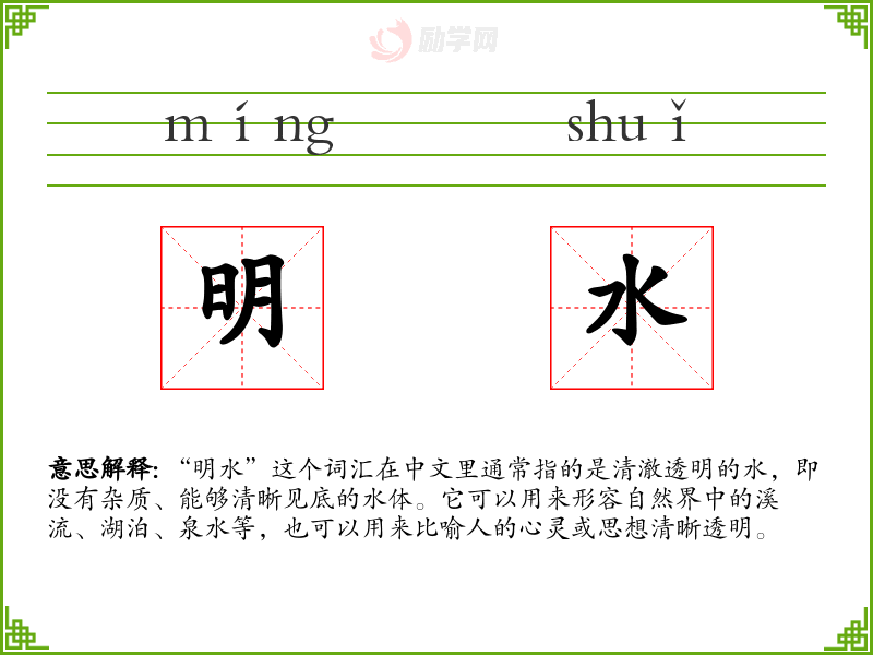 通过对“明水”这个词汇的深入学和分析,我更加理解了它在不同语境中的使用和意义。它不仅是一个形容水质的词汇,也是一个富有象征意义的词汇,能够激发人们对自然和心灵的思考。在语言学和表达中,正确使用“明水”这个词汇,能够丰富我的表达方式,增强语言的生动性和感染力。