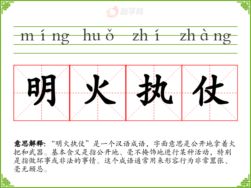 “明火执仗”是一个汉语成语,字面意思是公开地拿着火把和武器。基本含义是指公开地、毫不掩饰地进行某种活动,特别是指做坏事或非法的事情。这个成语通常用来形容行为非常嚣张、毫无顾忌。