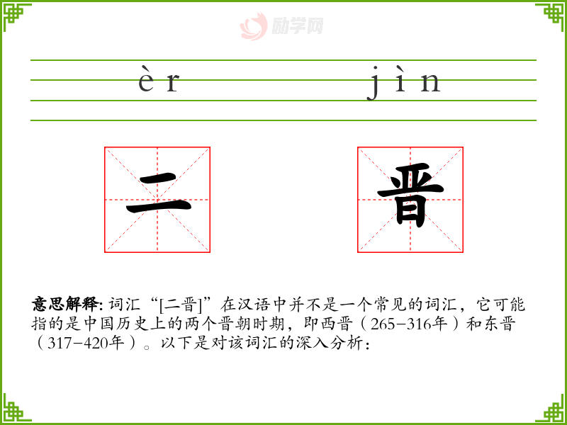 词汇“[二晋]”在汉语中并不是一个常见的词汇,它可能指的是*历史上的两个晋朝时期,即西晋(25-31*年)和东晋(317-420年)。以下是对该词汇的深入分析: