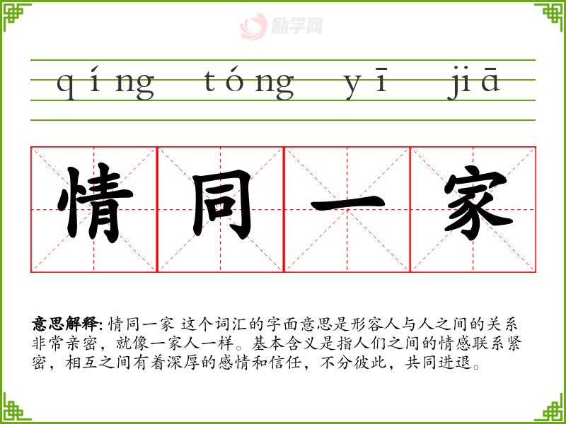 情同一家 这个词汇的字面意思是形容人与人之间的关系非常亲密,就像一家人一样。基本含义是指人们之间的情感联系紧密,相互之间有着深厚的感情和信任,不分彼此,共同进退。