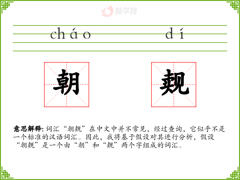 词汇“朝觌”在中文中并不常见,经过查询,它似乎不是一个标准的汉语词汇。因此,我将基于假设对其进行分析,假设“朝觌”是一个由“朝”和“觌”两个字组成的词汇。