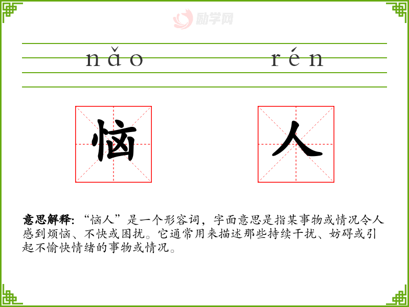 “恼人”是一个形容词,字面意思是指某事物或情况令人感到烦恼、不快或困扰。它通常用来描述那些持续干扰、妨碍或引起不愉快情绪的事物或情况。