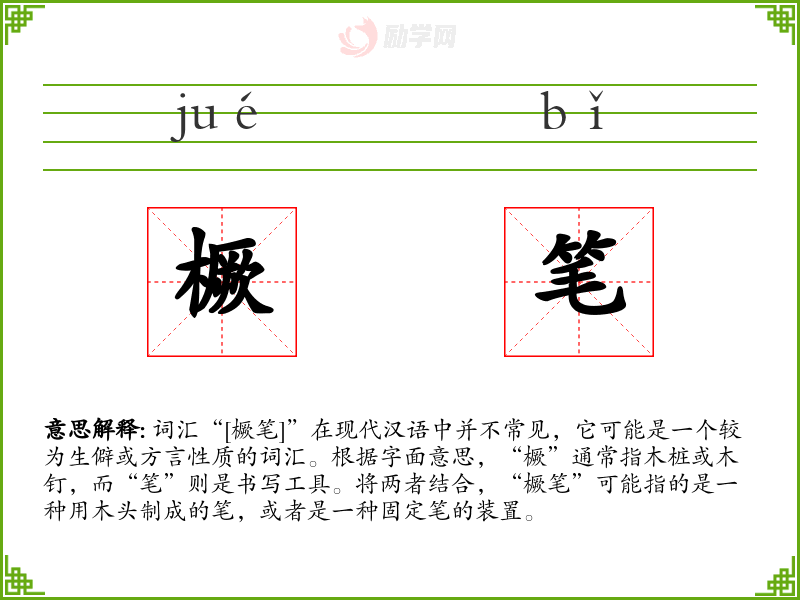 - 理解:橛笔是一个具有历史和文化价值的词汇,它不仅代表了古代的书写工具,也反映了人们对书写文化的传承和尊重。