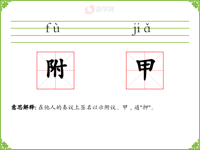 附甲的意思是:在他人的奏议上签名以示附议。甲﹐通"押"。