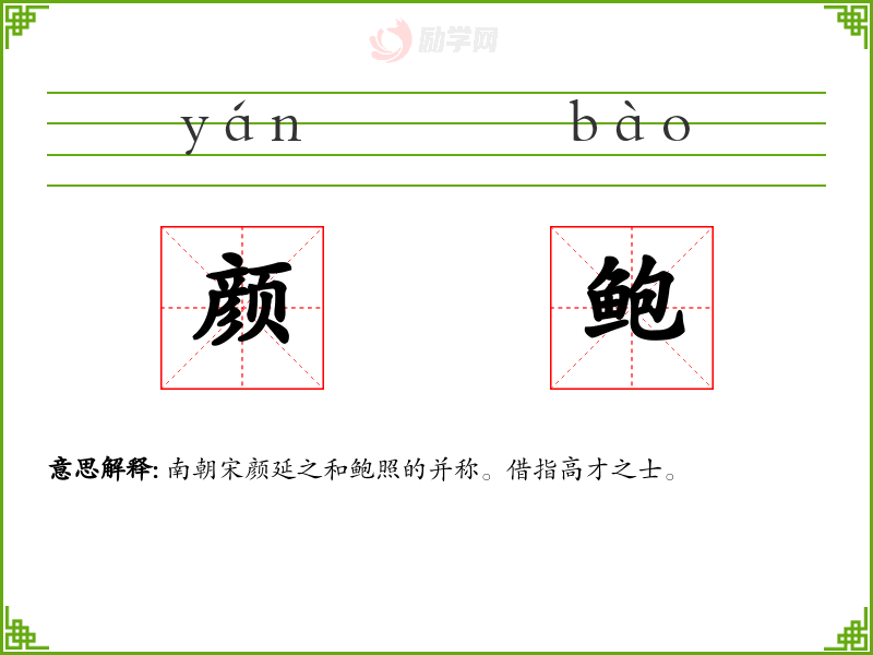 颜鲍的意思是:南朝宋颜延之和鲍照的并称。借指高才之士。