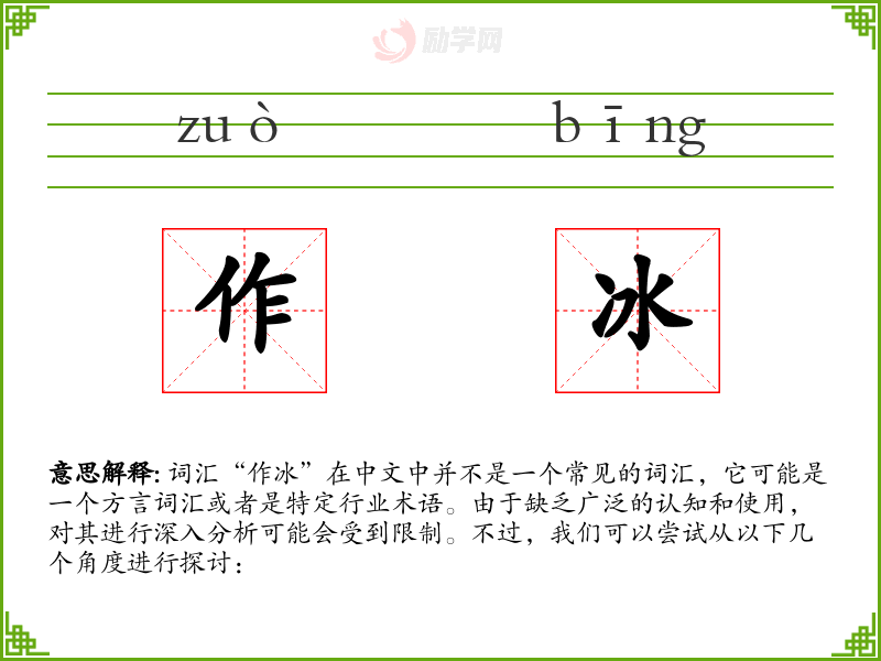 由于“作冰”不是一个常见的词汇,它在语言学习和表达中的重要性可能有限。不过,了解和学习这样的词汇可以帮助我们更好地理解语言的多样性和丰富性。