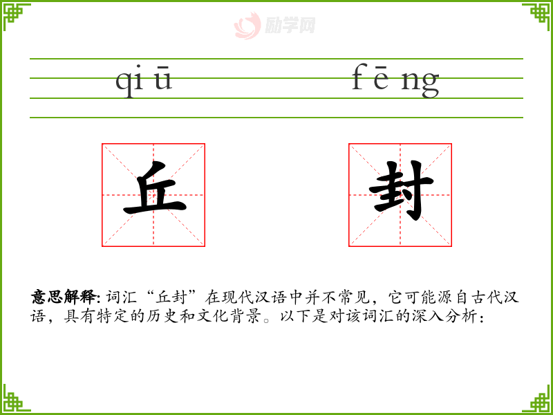 “丘封”作为一个历史词汇,虽然在现代汉语中不常用,但它承载了丰富的历史文化信息。了解这样的词汇有助于我们更好地理解古代社会和文化,对于语言学*和历史研究都具有重要意义。
