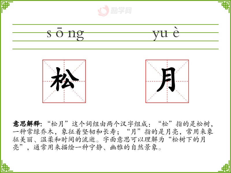 松月的意思是:松间明月。多用以渲染幽然情景。
