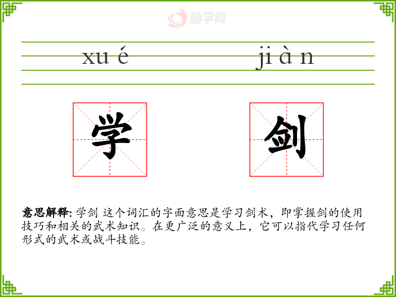 学剑 这个词汇的字面意思是学剑术,即掌握剑的使用技巧和相关的武术知识。在更广泛的意义上,它可以指代学任何形式的武术或战斗技能。