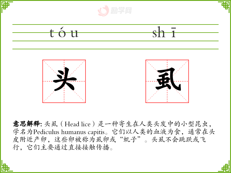 - 反义词:无(头虱是一个特定的生物学术语,没有直接的反义词)