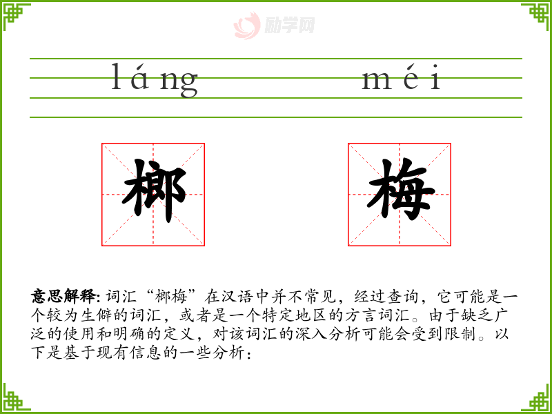 词汇“榔梅”在汉语中并不常见,经过查询,它可能是一个较为生僻的词汇,或者是一个特定地区的方言词汇。由于缺乏广泛的使用和明确的定义,对该词汇的深入分析可能会受到限制。以下是基于现有信息的一些分析: