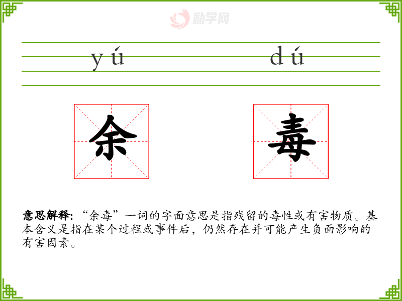 - 专业领域:在医学或化学领域,“余毒”特指药物或化学物质在体内或环境中的残留。