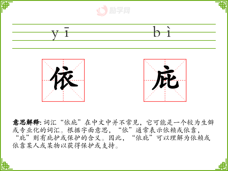 - 词源:“依”和“庇”都是古代汉语中的常用字,组合成“依庇”可能是后来逐渐形成的词汇。