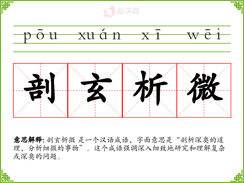 剖玄析微 是一个汉语成语,字面意思是“剖析深奥的道理,分析细微的事物”。这个成语强调深入细致地研究和理解复杂或深奥的问题。