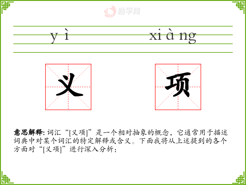 词汇“[义项]”是一个相对抽象的概念,它通常用于描述词典中对某个词汇的特定解释或含义。下面我将从上述提到的各个方面对“[义项]”进行深入分析: