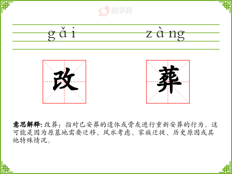 改葬一词由“改”和“葬”组成。在古代汉语中,“改”意味着改变或调整,“葬”则是指埋葬。随着时间的推移,这个词的含义和用法基本保持稳定。