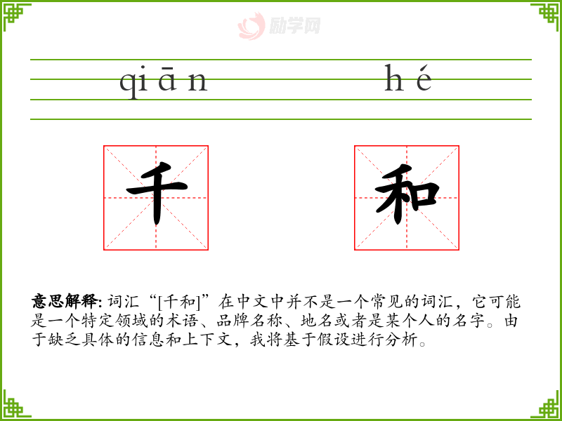 “千和”作为一个词汇,其具体含义和应用需要根据上下文来确定。在语言学习和表达中,了解词汇的背景和语境对于准确使用和理解至关重要。