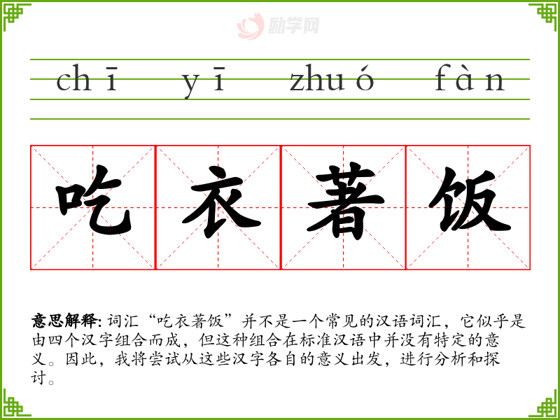 词汇“吃衣著饭”并不是一个常见的汉语词汇,它似乎是由四个汉字组合而成,但这种组合在标准汉语中并没有特定的意义。因此,我将尝试从这些汉字各自的意义出发,进行分析和探讨。
