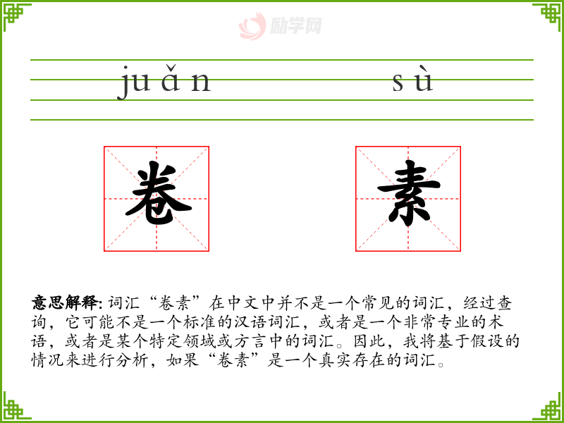 词汇“卷素”在中文中并不是一个常见的词汇,经过查询,它可能不是一个标准的汉语词汇,或者是一个非常专业的术语,或者是某个特定领域或方言中的词汇。因此,我将基于假设的情况来进行分析,如果“卷素”是一个真实存在的词汇。