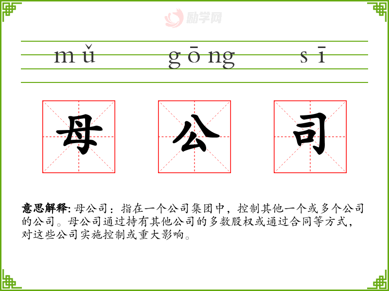 母公司:指在一个公司集团中,控制其他一个或多个公司的公司。母公司通过持有其他公司的多数股权或通过合同等方式,对这些公司实施控制或重大影响。
