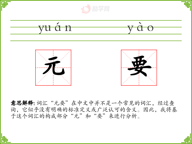 尽管“元要”不是一个常用词汇,但它体现了汉语中对事物本质和核心的重视。在语言学*和表达中,理解这样的词汇可以帮助我们更精确地表达思想和概念。