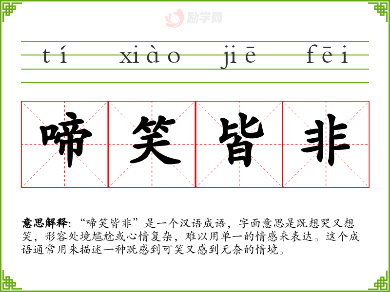 在文化中,“啼笑皆非”常用来描述人们在面对社会矛盾或个人困境时的复杂心理。它反映了人对于情感表达的细腻和含蓄,以及对于生活复杂性的深刻认识。