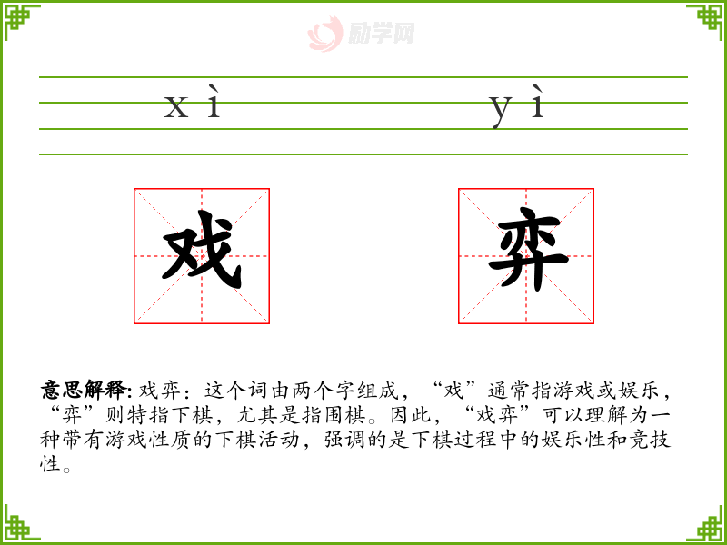 戏弈:这个词由两个字组成,“戏”通常指游戏或娱乐,“弈”则特指下棋,尤其是指围棋。因此,“戏弈”可以理解为一种带有游戏性质的下棋活动,强调的是下棋过程中的娱乐性和竞技性。