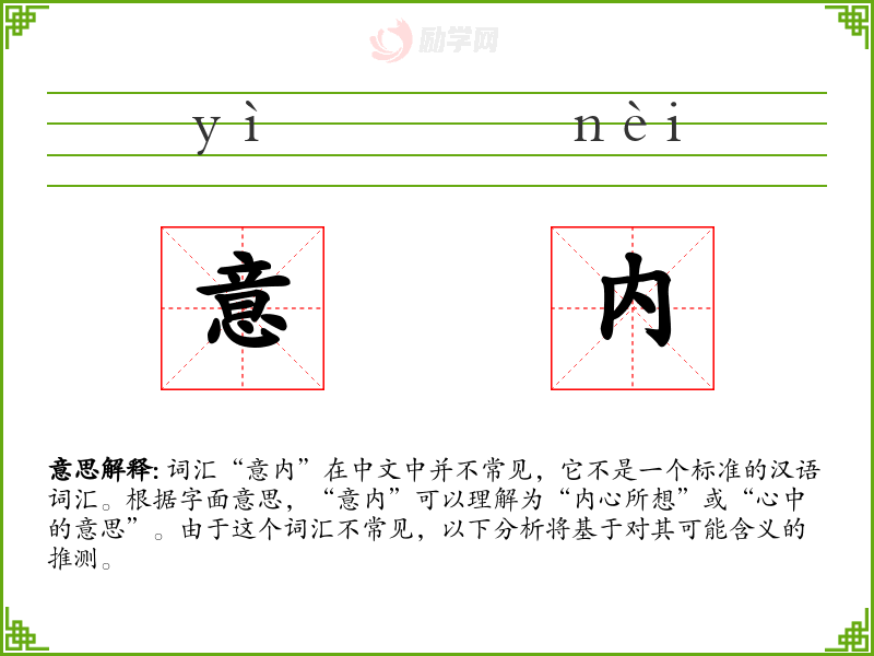 词汇“意内”在中文中并不常见,它不是一个标准的汉语词汇。根据字面意思,“意内”可以理解为“内心所想”或“心中的意思”。由于这个词汇不常见,以下分析将基于对其可能含义的推测。