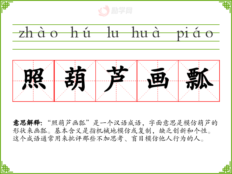 - 创新:强调创造新的事物或方法,与“照葫芦画瓢”形成鲜明对比。