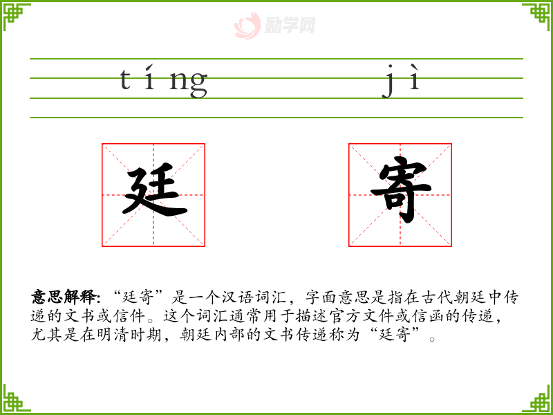 通过对“廷寄”这个词汇的学*和分析,我更加深入地理解了古代**朝廷的运作方式和文化背景。这个词汇虽然不常用于现代汉语,但它在历史研究和文学创作中仍然具有重要的价值。