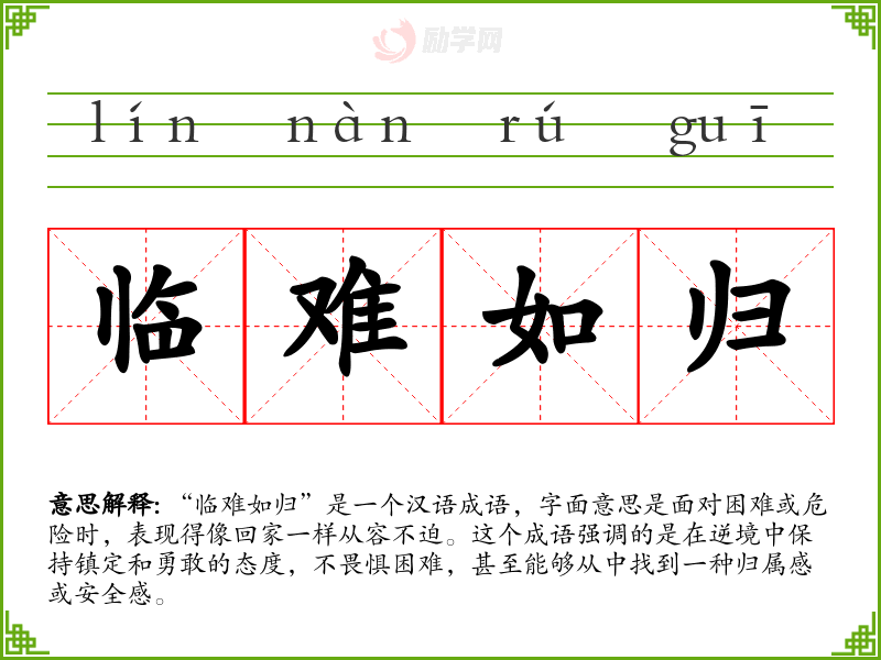 “临难如归”是一个汉语成语,字面意思是面对困难或危险时,表现得像回家一样从容不迫。这个成语强调的是在逆境中保持镇定和勇敢的态度,不畏惧困难,甚至能够从中找到一种归属感或安全感。