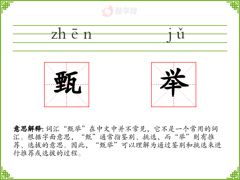 由于“甄举”不是一个常用词汇,它在文学、口语或专业领域中的使用较为有限。在古代文献或历史记载中,可能会出现这个词,用以描述选拔官员或人才的过程。