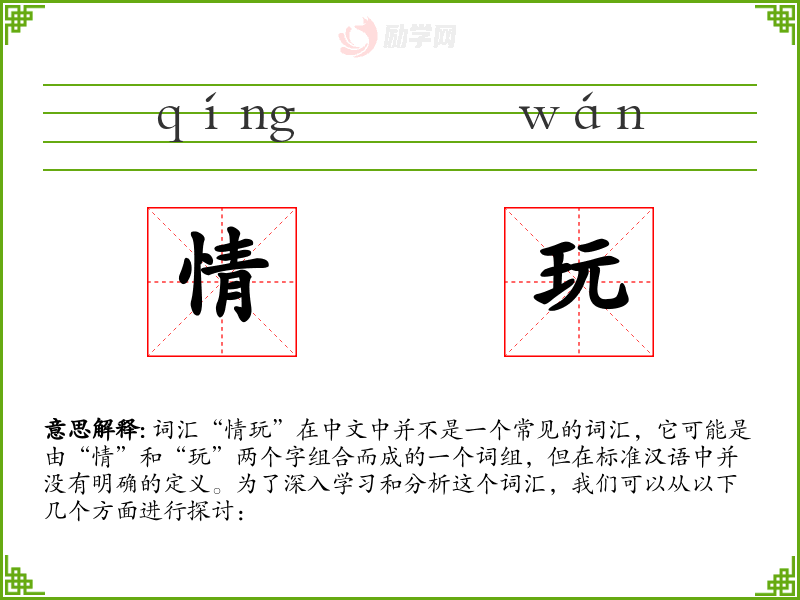 词汇“情玩”在中文中并不是一个常见的词汇,它可能是由“情”和“玩”两个字组合而成的一个词组,但在标准汉语中并没有明确的定义。为了深入学习和分析这个词汇,我们可以从以下几个方面进行探讨: