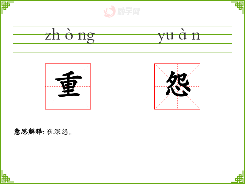 《说文》-怨,恚也。 《论语》。皇疏:“恨也。”-曰怨乎。 《贾子道术》-施行得理,谓之德。反德为怨。 《淮南子·说山》-不怨人取之。 《汉书·李广苏建传》-天子甚怨。 清·黄宗羲《原君》-人怨恶其君。 清·张廷玉《明史》-怨颇兴。 孙文《序》-怨愤所积。