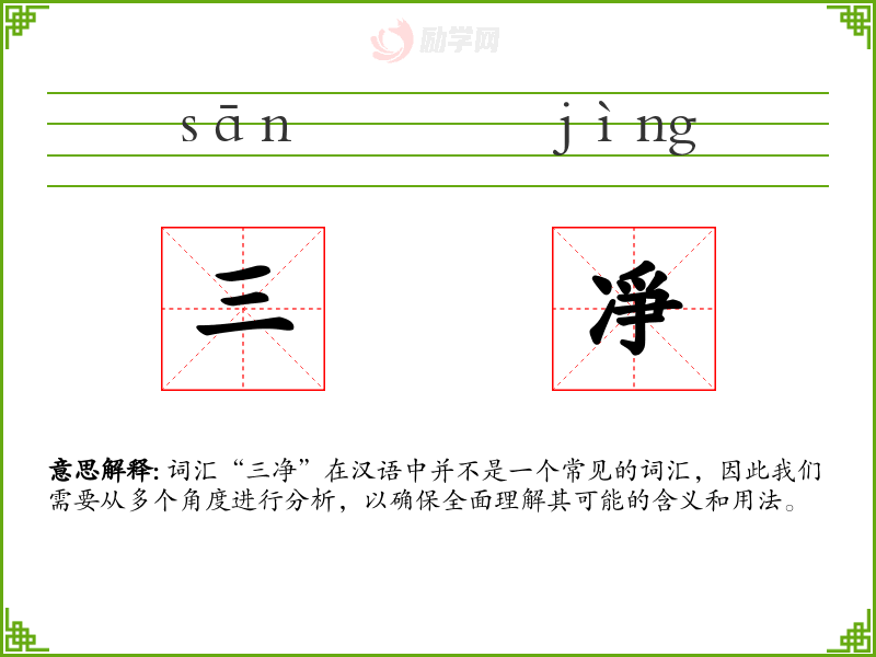 词汇“三净”在汉语中并不是一个常见的词汇,因此我们需要从多个角度进行分析,以确保全面理解其可能的含义和用法。