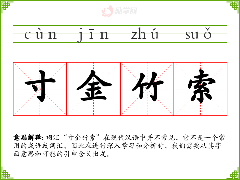 词汇“寸金竹索”在现代汉语中并不常见,它不是一个常用的成语或词汇,因此在进行深入学*和分析时,我们需要从其字面意思和可能的引申含义出发。