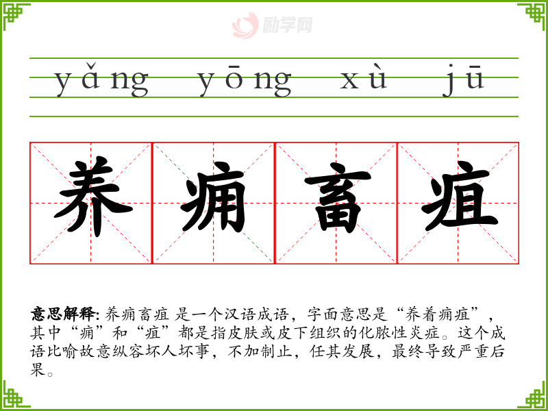养痈畜疽 这个成语源自古代医学术语,后来被引申为比喻义。在古代,痈疽是需要及时治疗的疾病,否则会危及生命。因此,这个成语强调了及时处理问题的重要性。