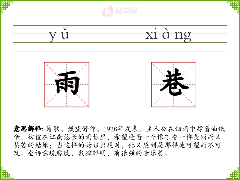 诗歌。戴望舒作。1928年发表。主人公在细雨中撑着油纸伞,彷徨在江南悠长的雨巷里,希望逢着一个像丁香一样美丽而又愁苦的姑娘;当这样的姑娘出现时,他又感到是那样地可望而不可及。全诗意境朦胧,韵律鲜明,有很强的音乐美。