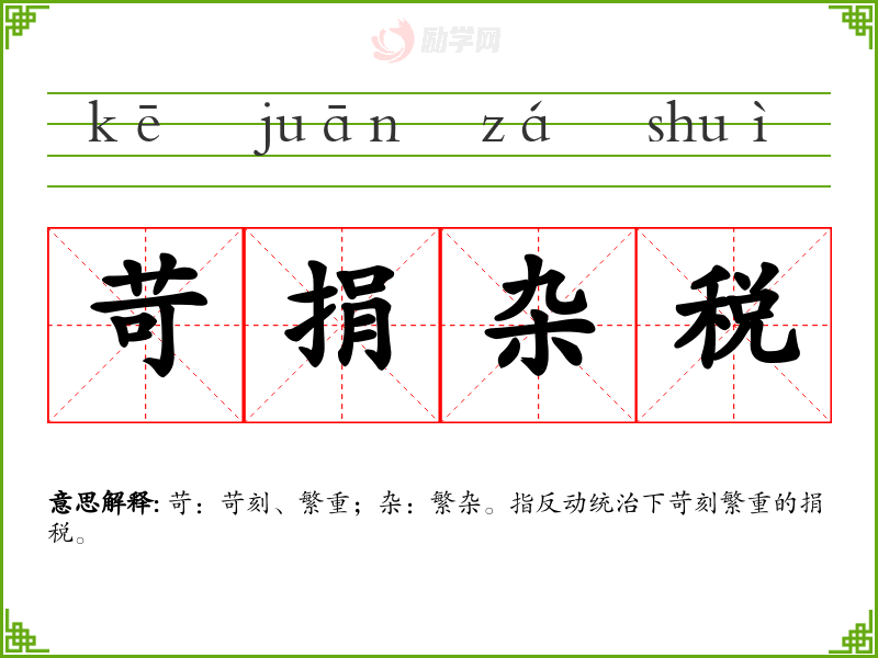 苛:苛刻、繁重;杂:繁杂。指反动统治下苛刻繁重的捐税。