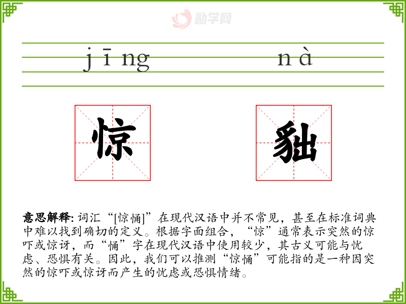- “惊”字源自古汉语,意为惊动、惊吓。