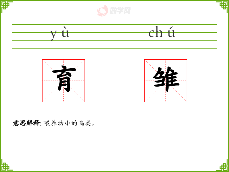 《说文》-雏,鸡子也。 《礼记·月令》。注:“新鸡也。”-乃以雏尝黍。 《孟子》-有人于此,力不能胜一匹雏,则为无力人矣。