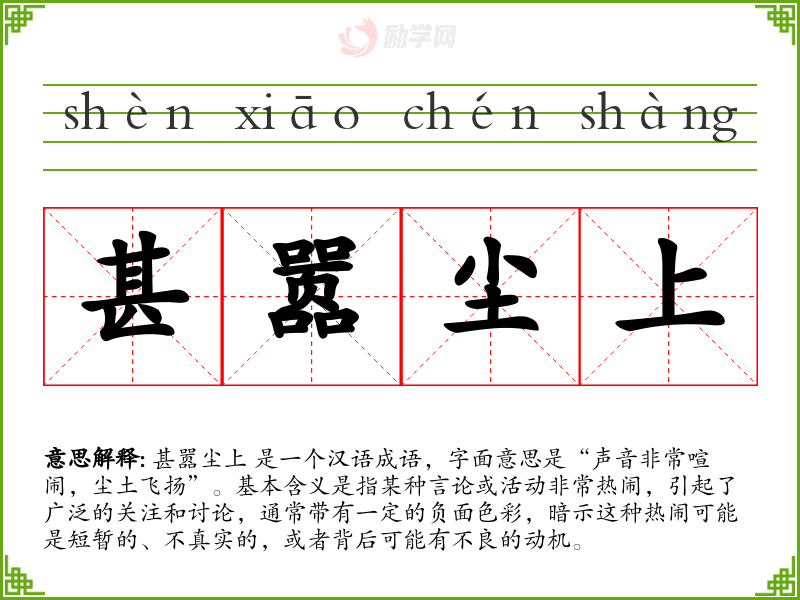 甚嚣尘上 是一个汉语成语,字面意思是“声音非常喧闹,尘土飞扬”。基本含义是指某种言论或活动非常热闹,引起了广泛的关注和讨论,通常带有一定的负面色彩,暗示这种热闹可能是短暂的、不真实的,或者背后可能有不良的动机。
