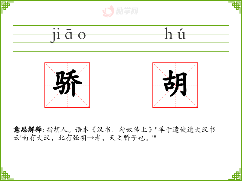骄胡的意思是:指胡人。语本《汉书.匈奴传上》"单于遣使遗大汉书云'南有大汉,北有强胡→者,天之骄子也。'"
