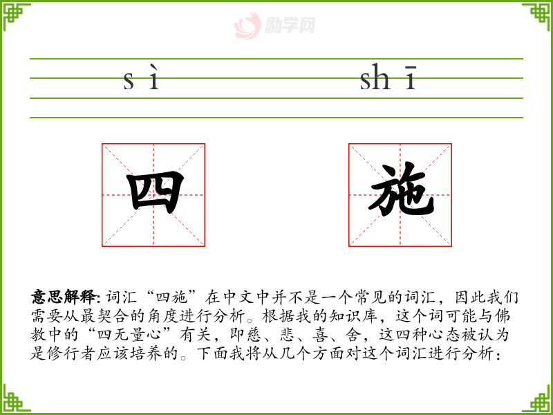 词汇“四施”在中文中并不是一个常见的词汇,因此我们需要从最契合的角度进行分析。根据我的知识库,这个词可能与**中的“四无量心”有关,即慈、悲、喜、舍,这四种心态被认为是修行者应该培养的。下面我将从几个方面对这个词汇进行分析: