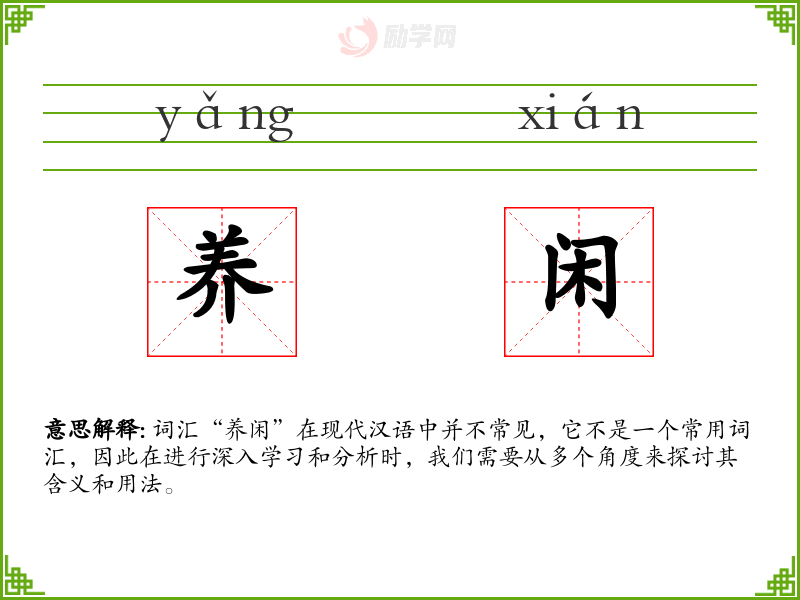 词汇“养闲”在现代汉语中并不常见,它不是一个常用词汇,因此在进行深入学*和分析时,我们需要从多个角度来探讨其含义和用法。