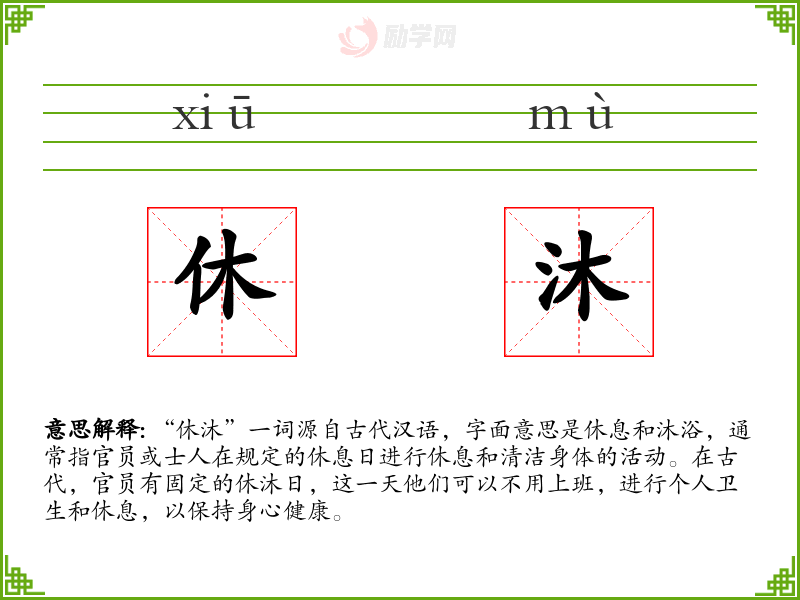 “休沐”一词的词源可以追溯到古代汉语,其中“休”意味着停止工作或休息,“沐”则指沐浴。随着时间的推移,这个词的含义逐渐固定为特指官员的休息日。