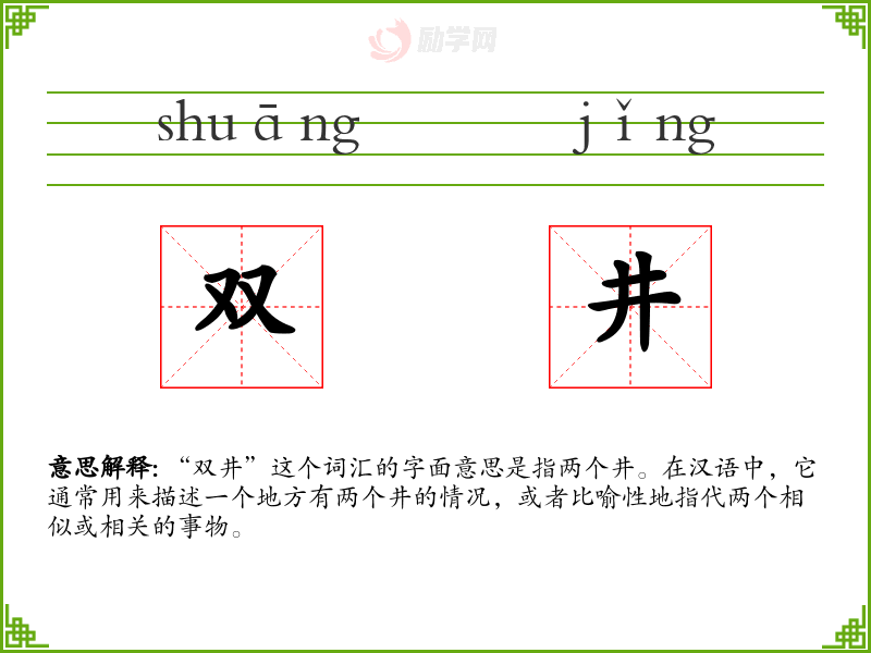 “双井”这个词汇的字面意思是指两个井。在汉语中,它通常用来描述一个地方有两个井的情况,或者比喻性地指代两个相似或相关的事物。